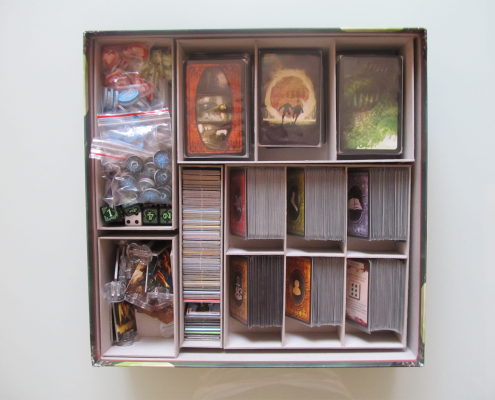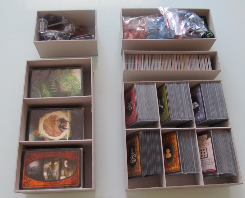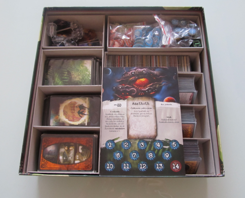 Pierwsze dwa sposoby stosuje zapewne zdecydowana większość z Was, może nawet oba jednocześnie, w zależności od potrzeb. Z trzecią metodą jest znacznie gorzej, to raczej niewielki odsetek. Główną przyczyną jest czasochłonność lub wykręty, że od dziecka miało się dwie lewe ręce do robótek ręcznych. O ile w kwestii czasu trudno się nie zgodzić, nierzadko wykonanie zajmuje więcej czasu niż rozegranie kilku partii w dany tytuł, to na lewe ręce spróbuję znaleźć sposób. Ten wpis (oraz kolejny – bardziej praktyczny) powstał właśnie w tym celu, aby pokazać że obróbka tektury to nic trudnego, każdy powinien sobie z tym poradzić. Wymaga to więcej zaangażowania niż kupienie strunowców czy pojemnika dla wędkarzy, jednak należy pamiętać o ogromnej zalecie tej metody – wszystko co robimy jest pod wymiar. Niezależnie od pudełka i liczby komponentów jesteśmy w stanie wszystko ergonomicznie rozmieścić tak by nie latało w środku. Jest to nasza wartość dodana, pudełko z plastiku może mieć każdy 😉