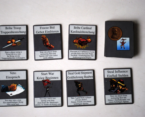 Sama nazwa talii – karty zdrady, sugeruje czego możemy się po nich spodziewać. Jest ich siedem różnych typów. Rozkład poszczególnych kart, podobnie jak kafli wojska jest nierównomierny. Obiektywnie patrząc, da się wskazać karty silniejsze i słabsze, lub mocno sytuacyjne. Początkowo, zakup kart nie był zbyt popularną akcją wśród osób, którym pokazywałem Książęta. Była to dość sporadycznie wybierana akcja. Pokrywało się to z opiniami graczy na bgg. Wszystko to do czasu jednej, pamiętnej partii z mst, na gliwickim Pionku. Wielu z Was pewnie kojarzy tę postać. Maszyna do zwycięstw, planszówkowy postrach południowej Polski. To co o nim napisano na stronie kapituły Planszowej Gry Roku, jest w 100% prawdą – po przeczytaniu instrukcji mst już nie jest początkującym. Tak samo było na Pionku. To właśnie mst pokazał nam gdzie drzemie siła kart. Karty pozwalają trzymać rywali w niepewności. Wprowadzają element gry psychologicznej. Już nie jesteśmy tak pewni wyniku wojny stając do walki z graczem posiadającym karty. Nie możemy sobie spokojnie czekać aż inni wystrzelają się z kasy i kupić po kosztach, bo wyrzucą nas z licytacji, Artyści zejdą i koniec. Od tamtego Pionka, dwie karty na ręce to podstawa.