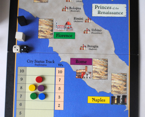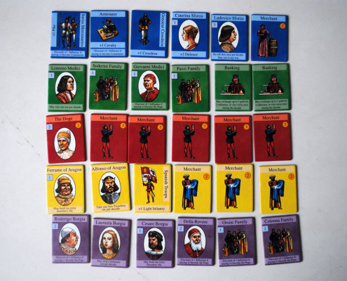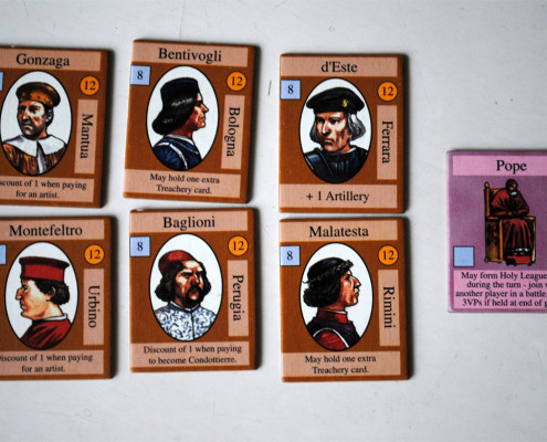 Kafle przedstawiają znane rodziny, stany, postacie renesansowych Włoch. Poszczególne żetony przypisane są do konkretnych miast. Oprócz punktów na koniec gry, wpływy w miastach przynoszą profity w trakcie całej rozgrywki. Zdecydowana większość z nich posiada unikatową zdolność, dostępną jedynie dla właściciela. Zatem udział, udziałowi nie jest równy, jak to zazwyczaj bywa. Nie kupujemy jedynie punktów, jakie możemy zdobyć w zależności od prestiżu danego miasta, ale kupujemy bonus. Nierzadko to właśnie on winduje cenę kafla w górę. Dodatkowo, pozyskany udział w mieści determinuje sojusz w jaki wejdziemy na tym etapie gry. W grze udziałowej, granie samemu sprawdza się tylko na krótką metę. Sojusze, długie lub krótkie, to podstawa. Dywersyfikacja wpływów pozwala nam zyskiwać na rozwoju potęgi danego miasta przez innych graczy. W grze, w której o wartości miasta (firmy) decydują nie tylko sprawne zarządzanie i obliczenia, ale również agresywne ruchy rywali, jest to niezmiernie ważne. Co więcej, zasady gry narzucają maksymalną ilość posiadanych żetonów miast – 6 sztuk, nie więcej niż z 3 różnych miast. Jeśli wspomnimy również, że raz kupionego kafla nie można odsprzedać, dostrzeżemy że decyzja co kupić, nie jest już taka prosta. Oczywiście, w grze z licytacją łatwo się teoretyzuje, a zazwyczaj gra się w myśl zasady „ ja nie potrzebuje, ale nie pozwolę żebyś Ty miał” 😉