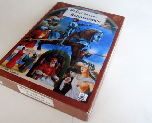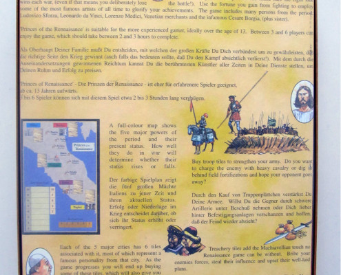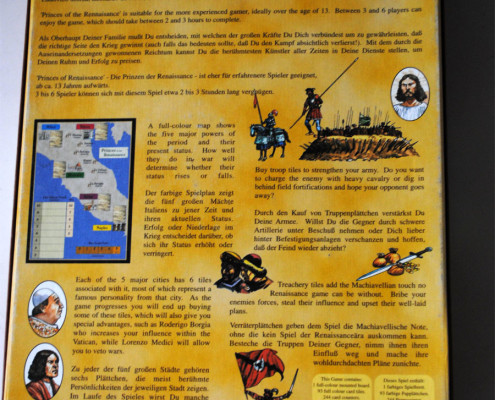 W standardowej recenzji, w początkowych akapitach powinno się pojawić parę słów na temat wykonania i jakości komponentów. Oczywiście, że liczy się to, w co gramy, a nie czym, jednak nie możemy zapomnieć o fanach drewna i tektury ( zapach świeżo otwartego pudła, mmm…. ale nie zbaczajmy z tematu ;)). Niestety, już od startu napotykam na drobny problem. Książęta Renesansu nie są grą, którą można dostać w jednym ze sklepów wskazanych przez i-szopa, wręcz przeciwnie. Jest to jeden z bielszych kruków planszowego świata, jeśli chodzi o dostępność. Jeden nakład, do tego raczej skromny, brak dodruków, przez co gra posiada status out of print już od wielu lat. Magiczne trzy litery – OOP, powodują że egzemplarze osiągają nieprzyzwoite ceny. Jak na razie zdrowy rozsądek wygrywa i nie zdecydowałem się na wydanie czterech stówek na egzemplarz, jak na razie…Z tego co się orientuje, w Polsce jest paru szczęśliwców, mogących się pochwalić posiadaniem pudła z żabą o numerze 1013. Jednego z nich nawet znam, dzięki czemu będziecie mogli podziwiać zdjęcia oryginału (dzięki staszek !). No właśnie, zdjęcia. Opis komponentów ograniczę do przedstawienia jedynie zdjęć. Nie miałem oryginału w ręce, więc się nie wypowiem. Jaki koń każdy widzi, oceńcie sami. Nie będę ukrywał, że dla mnie też ta plansza jest straszna. Na szczęście, nie o grafikę w tej grze chodzi.